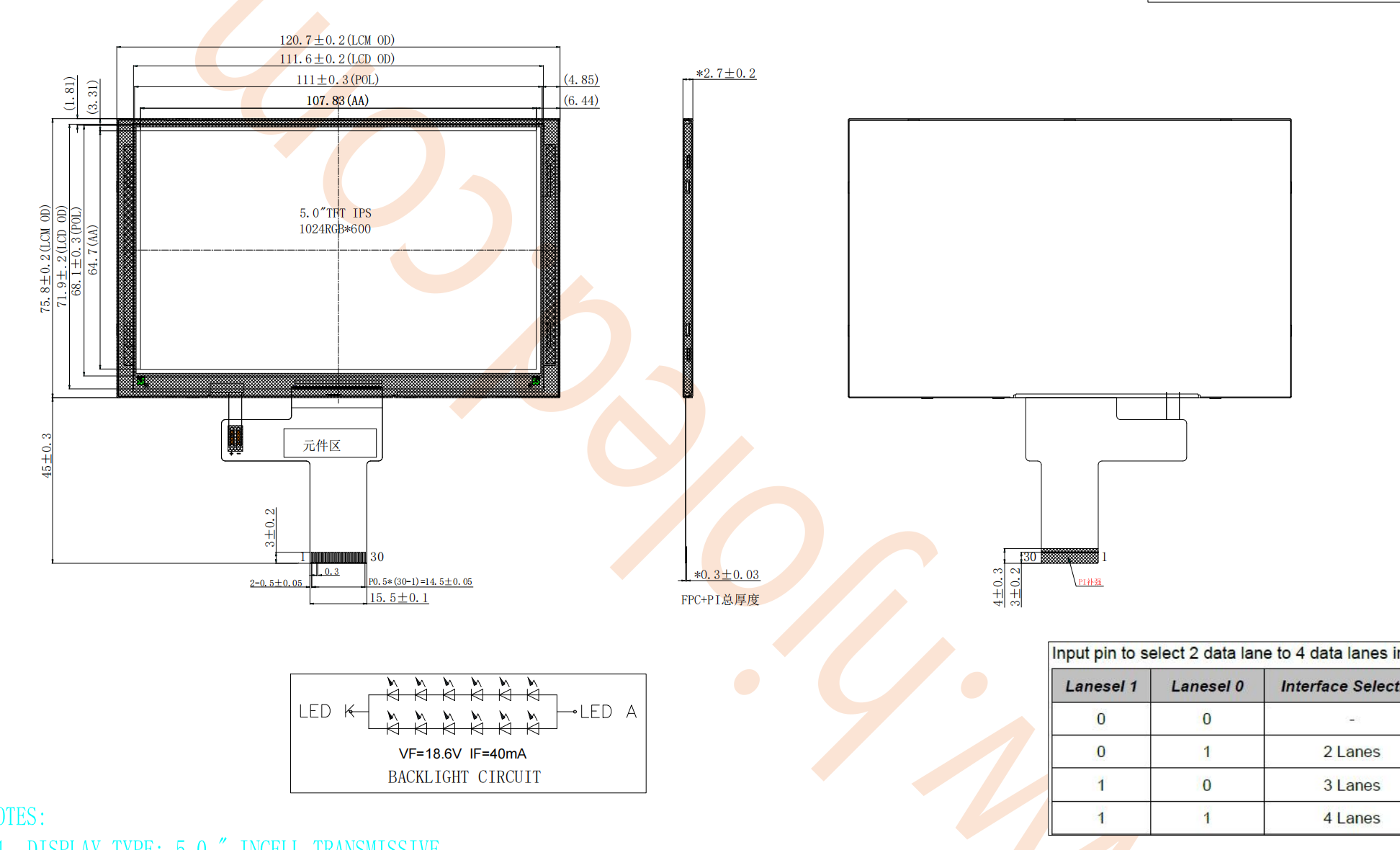 传统5寸TFT横屏一般分辨率是480*272和高清800*480,还有1024*600都是标准RGB接口,有40PIN和50PIN两种,没有MIPI接口,有些客户需要MIPI接口的就只能用竖屏,竖屏对客户的结构来说又不好设计,对结构工程师带来了烦恼。深圳鸿佳联合科技工程师为了解决这个烦恼,批量生产了5寸高清TFT横屏,分辨率1024*600,MIPI接口,支持2/3/4通道,30PIN标准插接,驱动IC是ST72325, 采用INCELL工艺,带触摸屏功能,只要贴合上一张盖板玻璃就可以当完整的电容触摸屏使用,中间没有触摸功能片能降低整个模组的厚度,整机可以做薄,提高手感,也显著减少整机的成本,受到很多客户的青睐。