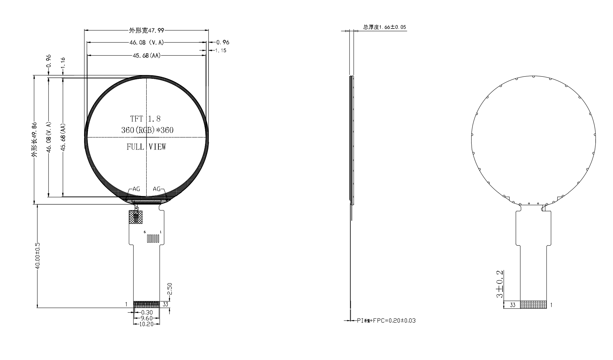 产品简介:HJ1800-01是一款1.8寸圆形液晶屏,兼容SPI/MCU/QSPI/MIPI接口,通过IM口可以选择接口,33PIN标准插接,分辨率360*360,超宽工作温度-30到85度。