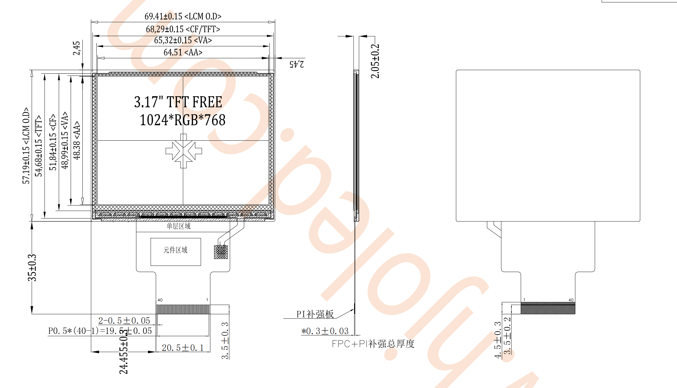 产品简介:3.17寸TFT横屏支持16/18/24BIT RGB接口,40PIN标准插接,分辨率1024*768,高清分辨率,横屏显示,左右边框均等黄金比例,亮度支持500-1000流明,户外阳光直射清晰可读。