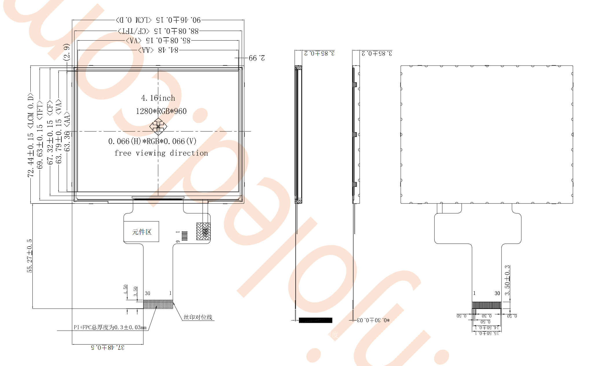 产品简介:4.16寸TFT横屏,30PIN标准插接,分辨率1280*960,高清分辨率,横屏显示黄金比例,MIPI接口,亮度支持500-1500流明,户外阳光直射清晰可读,超宽工作温度-30到85度,适合需要高温高冷的环境。